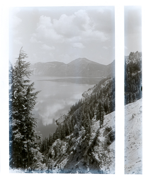 Looking down cliffs to Crater Lake circa 1915. View looking east from Rim Village area.